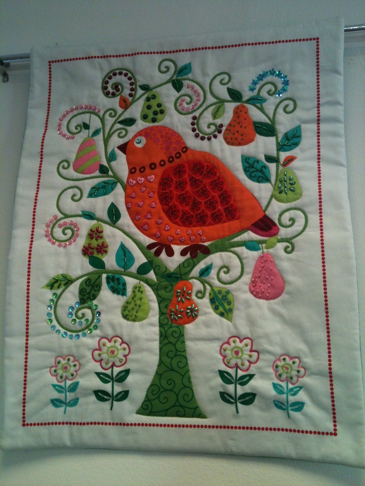 Well so far this year I have been mostly getting up to date on unfinished items, but we had Christmas Club looming up for this week and I had to get my head together and come up with a good idea for them to make - so I made the wall hanging above and have to say I thoroughly enjoyed making the scrappy Christmas trees. Fortunately all our ladies agreed and the picture below are two of their efforts. All of the ladies made great hangings - though one turned it into a table runner which was a good idea.